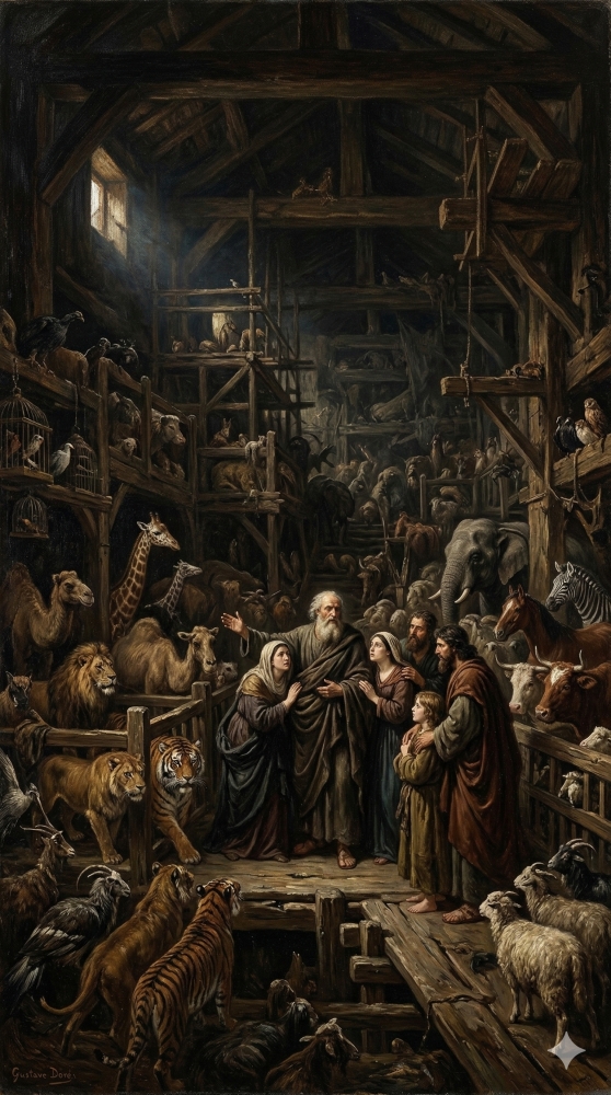И еще один момент обращает на себя внимание. Ковчег построен. Его наполняют животные и птицы. Они пришли сюда по внушению Божию. Как, спросим мы, вся живность уместилась в одном корабле? Здесь на помощь приходит уже простой расчет. Ковчег был гигантских размеров. Вспомним, что говорит о нем Библия: «длина ковчега триста локтей; ширина его пятьдесят локтей, а высота его тридцать локтей». Если учитывать, что длинна локтя чуть более сорока пяти сантиметров, то размеры ковчега могли быть следующие: около 140 метров в длину, 23 в ширину и 14 в высоту. Корабль такого размера мог вместить около 600 товарных вагонов. Если учитывать современные нормы перевозки скота, Ной в ковчег могли бы расположиться около 66000 пар овец. Кроме того, вспомним, что не все виды живых организмов нуждались в спасении от воды. Большая часть живых организмов вполне комфортно чувствует себя именно в воде. После того, как животные устроились в ковчеге, в корабль входит сам Ной и его семья. Наступают последние мгновения покоя. Весь мир замер в ожидании бури.