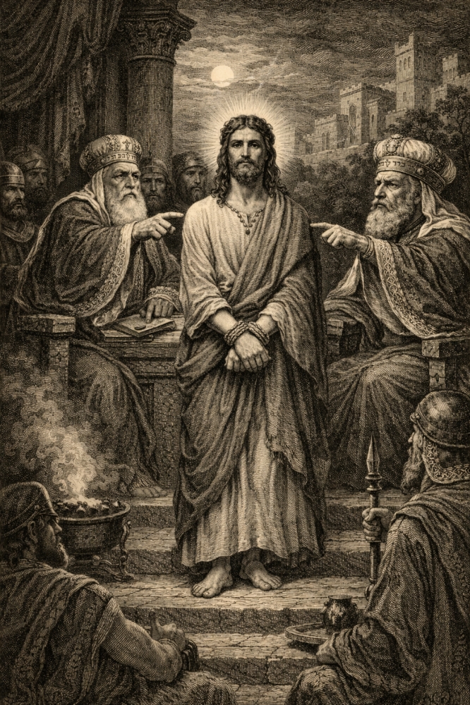 Священники хотели выдвинуть два обвинения: богохульство (тогда Его осудили бы иудеи) и подстрекательство к бунту (тогда бы его, наверняка, осудили и римляне). Начальствующие старались ускорить суд. Они знали, как почитает народ Иисуса, и опасались, что если об аресте станет известно, то, возможно, Его попытаются освободить. Кроме того, если суд и исполнение приговора не будут произведены немедленно, придется ждать неделю из-за празднования Пасхи. А это могло вновь нарушить их планы. Чтобы добиться осуждения Иисуса, им нужна была поддержка озлобленной толпы, большую часть которой составляла иерусалимская чернь. Если суд отложить на неделю, возбуждение улеглось бы, и положение могло полностью измениться. Лучшая часть народа приняла бы сторону Христа, многие выступили бы со свидетельствами в Его оправдание, рассказывая о великих делах, которые Он сотворил. И это возбудило бы в народе гнев против синедриона. Тогда осудили бы членов синедриона, а Иисус был бы освобожден и вновь принимал бы поклонение толпы. И поэтому священники и правители решили: прежде чем их замыслы станут всем известны, предать Иисуса в руки римлян.