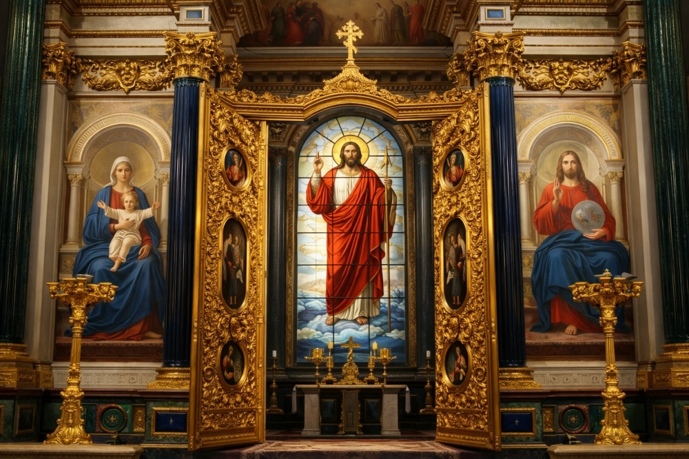На протяжении всей пасхальной недели Царские врата в алтарь остаются открытыми настежь в знак того, что Христос своим Воскресением открыл людям путь в Царствие Небесное и рай снова открыт для людей.