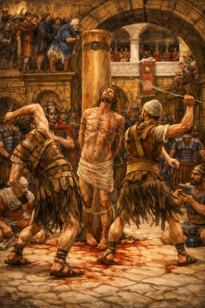 Пилат приказал бичевать Иисуса (обыкновенно бичевание предшествовало распятию).