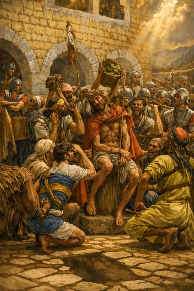 Поздним утром Страстной пятницы воины отводят Христа в преторию, собирают весь полк, одевают Его в багряницу и возлагают на голову терновый венец. Его бьют по голове тростью, плюют и насмехаются, становясь на колени и кланяясь Ему как Царю. Чтобы осмеять Иисуса, «Царя Иудейского», на него надевают красную власяницу, венец из терновника и дают в руки жезл.