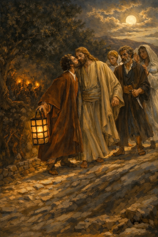 С отрядом воинов и служителей от первосвященников и фарисеев, с фонарями и светильниками и оружием появляется Иуда и поцелуем выдает Христа.