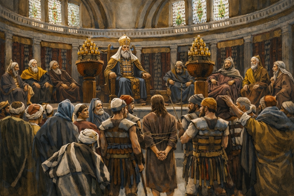 У Каиафы собираются книжники и старейшины. Первосвященники и старейшины и весь синедрион ищут лжесвидетельства против Иисуса, чтобы предать Его смерти.