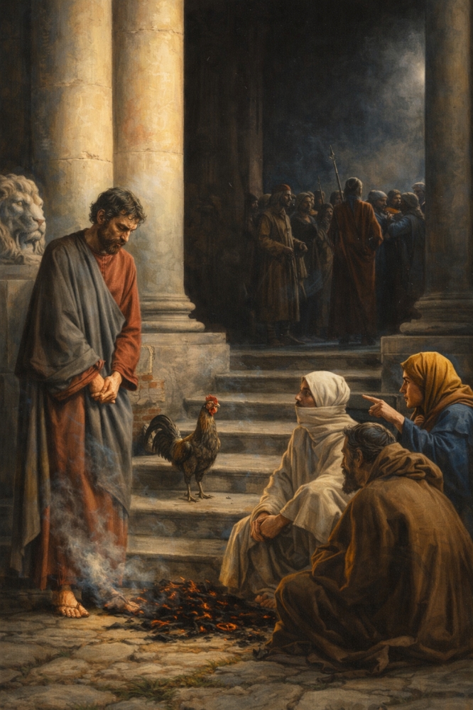 Петр трижды отрекается и слышит, как поет петух. Исполняется слова Господа: «Петр, не пропоет петух сегодня, как ты трижды отречешься, что не знаешь Меня» (Лк 22:34). Петр в слезах уходит. Наступает рассвет.