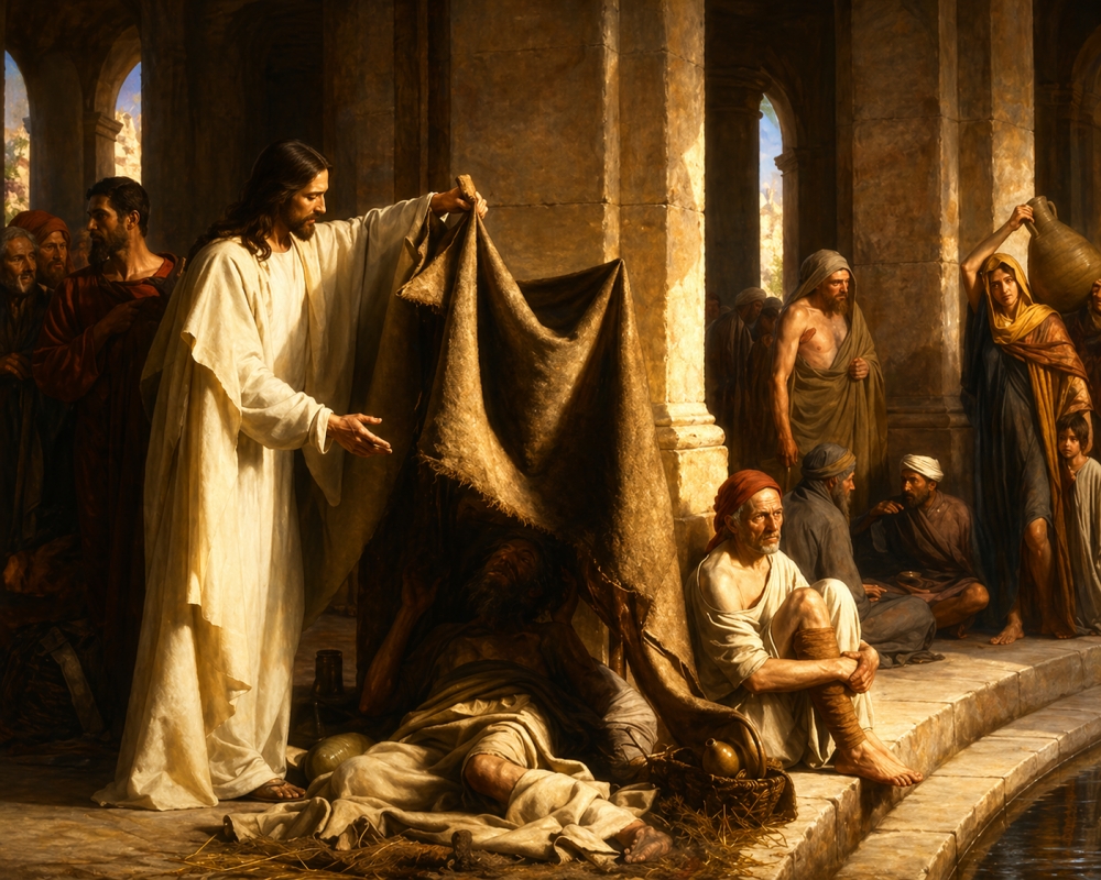 Был праздник Иудейский, и пришел Иисус в Иерусалим. Есть же в Иерусалиме у Овечьих ворот купальня, называемая по-еврейски Вифезда, при которой было пять крытых ходов. В них лежало великое множество больных, слепых, хромых, иссохших, ожидающих движения воды, ибо ангел Господень по временам сходил в купальню и возмущал воду, и кто первый входил в нее по возмущении воды, тот выздоравливал, какою бы ни был одержим болезнью. Тут был человек, находившийся в болезни тридцать восемь лет. Иисус, увидев его лежащего и узнав, что он лежит уже долгое время, говорит ему: хочешь ли быть здоров? Больной отвечал Ему: так, Господи; но не имею человека, который опустил бы меня в купальню, когда возмутится вода; когда же я прихожу, другой уже сходит прежде меня. Иисус говорит ему: встань, возьми постель твою и ходи. И он тотчас выздоровел, и взял постель свою и пошел. Было же это в день субботний. Посему Иудеи говорили исцеленному: сегодня суббота; не должно тебе брать постели. Он отвечал им: Кто меня исцелил, Тот мне сказал: возьми постель твою и ходи. Его спросили: кто Тот Человек, Который сказал тебе: возьми постель твою и ходи? Исцеленный же не знал, кто Он, ибо Иисус скрылся в народе, бывшем на том месте. Потом Иисус встретил его в храме и сказал ему: вот, ты выздоровел; не греши больше, чтобы не случилось с тобою чего хуже. Человек сей пошел и объявил Иудеям, что исцеливший его есть Иисус.
