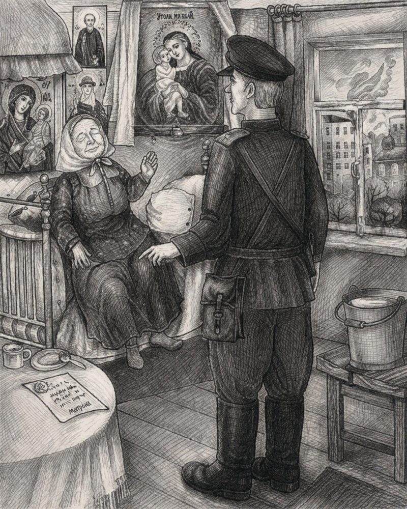 Однажды пришел милиционер забирать Матрону, а она ему и говорит: «Иди, иди скорей, у тебя несчастье в доме! А слепая от тебя никуда не денется, я сижу на постели, никуда не хожу». Он послушался. Поехал домой, а у него жена от керогаза обгорела. Но он успел довести ее до больницы. Приходит он на следующий день на работу, а у него спрашивают: «Ну что, слепую забрал?» А он отвечает: «Слепую я забирать никогда не буду. Если б слепая мне не сказала, я б жену потерял, а так я ее все-таки в больницу успел отвезти».