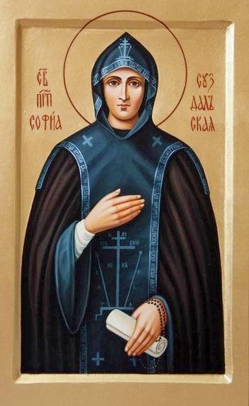 Прп. София, в миру великая княгиня Соломония, первая жена великого князя Московского Василия III (отца Иоанна Грозного), была насильно пострижена в монахини (1525) после 20 лет бездетного брака и сослана под стражу в Суздальский Покровский монастырь, где подвигами изгнала из сердца мирские помыслы, всецело посвятив себя Богу. Скончалась в 1542 году.