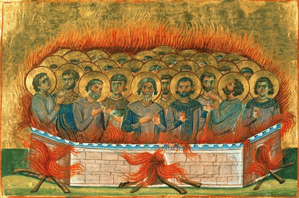 Перевод: Крепкие душой в вере, святые, претерпели страдания в огне, двадцать тысяч мучеников, взывая к Родившемуся от Девы: «Прими жертву всесожжения нашего за Тебя, как дары персидских царей, золото, смирну и ладан, Превечный Боже».