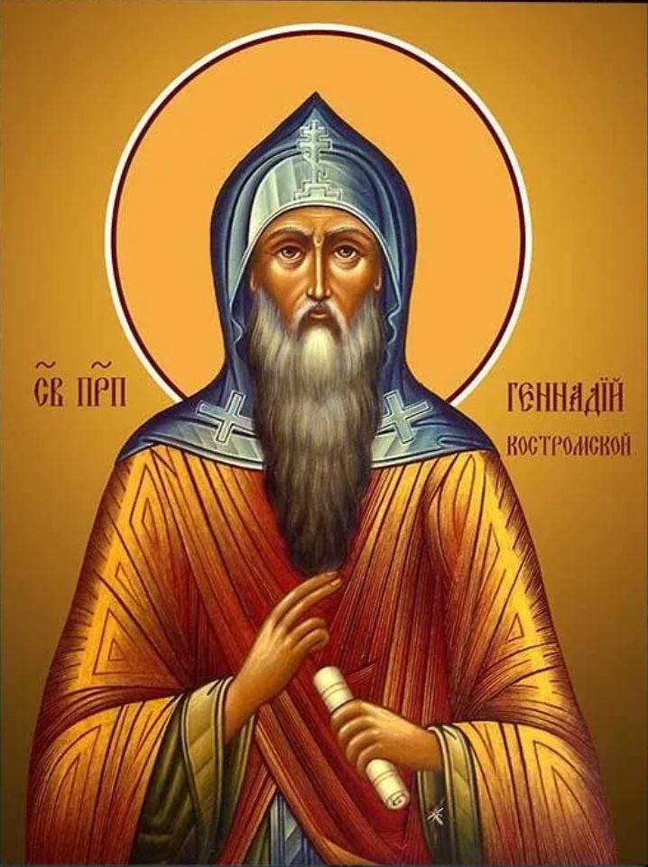 Преподобный Геннадий Костромской и Любимоградский (в миру Григорий) — святой Русской Православной Церкви, основатель Спасо-Преображенского Геннадиева монастыря (до 1647 года Новая Корнилиева пустынь). Вместе с братией участвовал в монастырских работах: рубил лес, носил дрова, делал свечи и пёк просфоры. Любимым занятием было писание икон, которыми он украшал обитель. Постоянно носил на себе тяжёлые вериги. Был духовником Ивана Грозного и крестил его дочь Анну. За свою святую жизнь преподобный Геннадий получил от Господа дар прозорливости и чудотворений. Исцеляя болящих, преподобный призвал их к покаянию и памятованию о часе смертном.