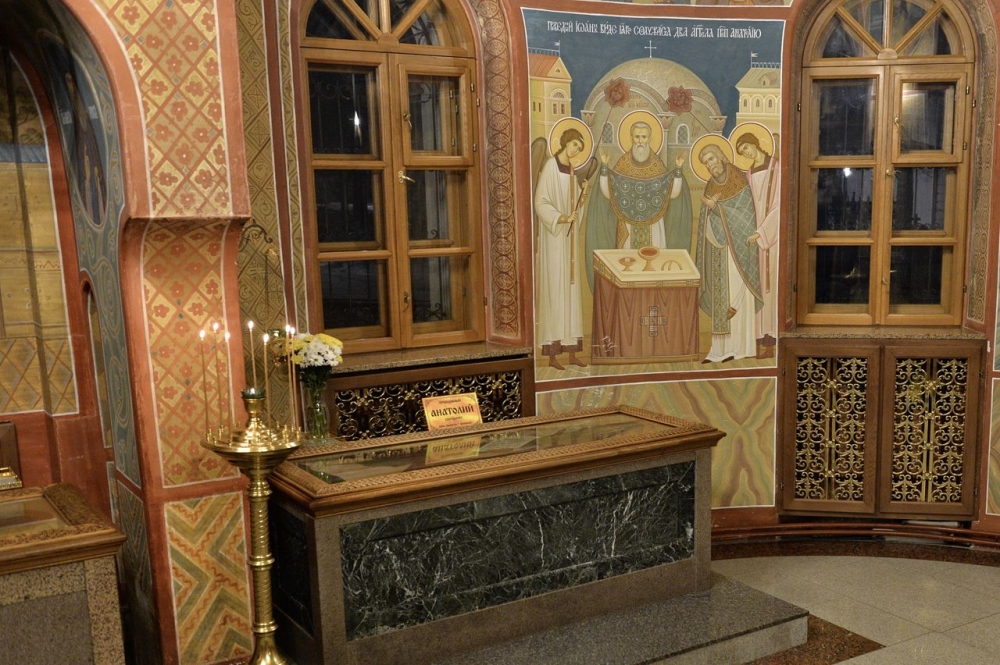 Рака с мощами преподобного старца Анатолия Оптинского (Зерцалова) во Владимирском храме Оптиной пустыни