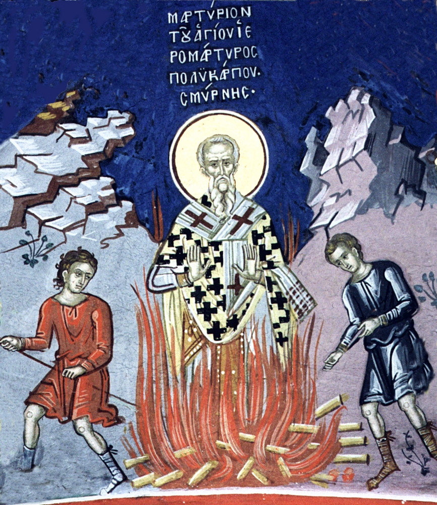 Святой был приговорен к сожжению заживо. Согласно преданию, пламя не коснулось его тела, а приняло вид паруса, окружая мученика. Тогда палач пронзил его кинжалом, и хлынувшая кровь погасила огонь. Смерть Поликарпа датируется приблизительно 23 февраля 155 или 156 года.