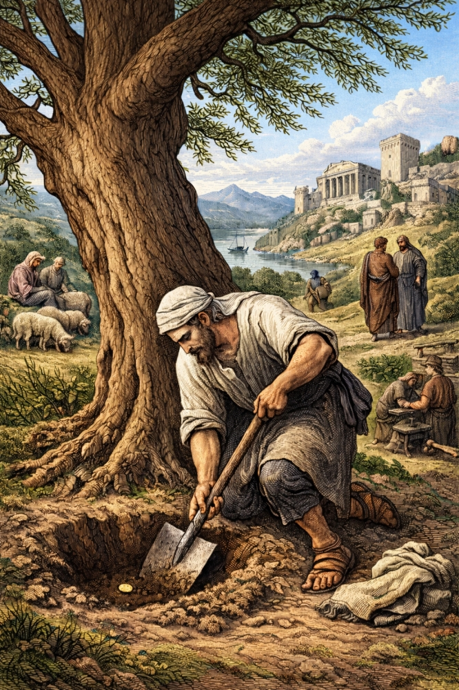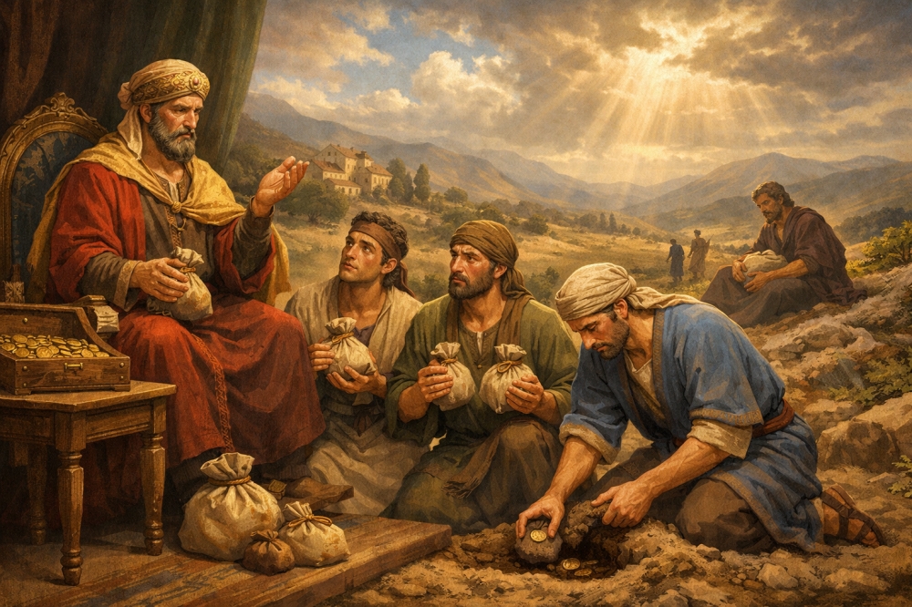 Хотите ли знать, – как бы так говорит Он Своим апостолам, – как поступит Сын Человеческий по Своем пришествии и как должно поступать вам, ожидающим Его пришествия? Выслушайте еще одну притчу: ИБО ОН ПОСТУПИТ, КАК ЧЕЛОВЕК, КОТОРЫЙ, ОТПРАВЛЯЯСЬ В далекую ЧУЖУЮ СТРАНУ, ПРИЗВАЛ РАБОВ СВОИХ, не наемных служителей, а собственных рабов, с которых мог строго взыскать за неисправность, И ПОРУЧИЛ ИМ ИМЕНИЕ СВОЁ, отдал им на руки свои капиталы: И ОДНОМУ, более ревностному и способному, ДАЛ ОН ПЯТЬ ТАЛАНТОВ, ДРУГОМУ ДВА, ИНОМУ ОДИН, КАЖДОМУ ПО ЕГО СИЛЕ и способностям, с тем, чтобы они пустили эти деньги в оборот; И ТОТЧАС ОТПРАВИЛСЯ. В отсутствии господина каждый раб мог действовать свободно, как хотел. Так и было: рабы честные, добросовестные немедленно принялись за дело. ПОЛУЧИВШИЙ ПЯТЬ ТАЛАНТОВ ПОШЕЛ, УПОТРЕБИЛ ИХ В ДЕЛО, пустил их в оборот, И ПРИОБРЕЛ трудами своими ДРУГИЕ ПЯТЬ ТАЛАНТОВ; ТОЧНО ТАК ЖЕ поступил И ПОЛУЧИВШИЙ ДВА ТАЛАНТА и ПРИОБРЕЛ ДРУГИЕ ДВА. Но не так поступил третий: ПОЛУЧИВШИЙ ЖЕ ОДИН ТАЛАНТ ПОШЕЛ И ЗАКОПАЛ ЕГО В ЗЕМЛЮ И СКРЫЛ СЕРЕБРО ГОСПОДИНА СВОЕГО. Ему не хотелось трудиться, обременять себя заботами, – он хотел воспользоваться отсутствием господина, чтобы предаться праздности на свободе.