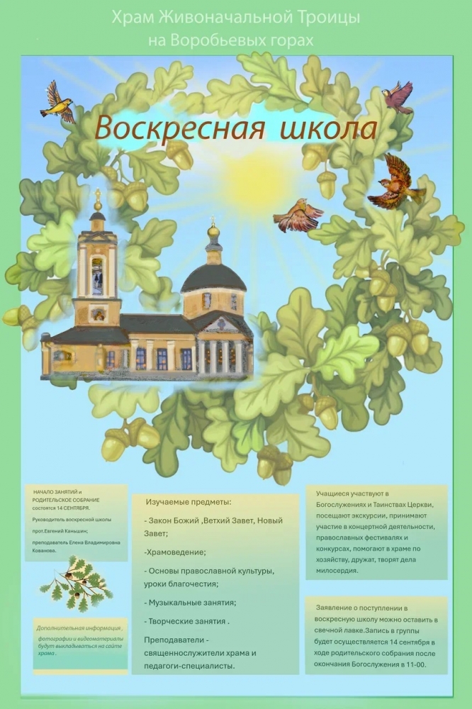 На нашем приходе открывается ВОСКРЕСНАЯ ШКОЛА. В программе 3 предмета: «ЗАКОН БОЖИЙ», «ИСТОРИЯ ЦЕРКВИ» и «ИСКУССТВО ЦЕРКОВНОГО ПЕНИЯ». Приглашаются дети в возрасте от 7 до 12 лет. Занятия начнутся 6 сентября. Начало в 13.30. Далее еженедельно по субботам в это же время.