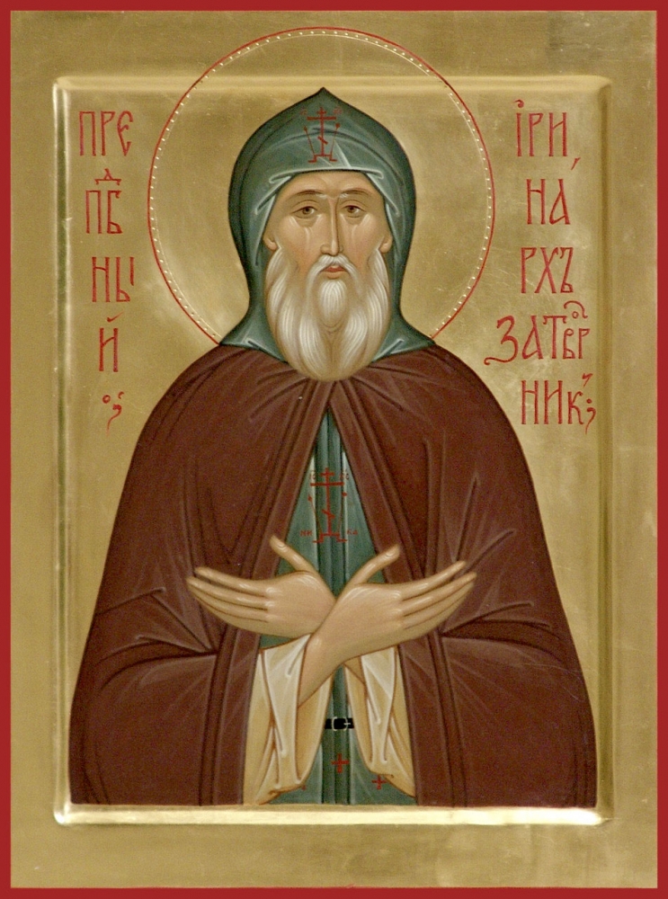 О, вели́кий уго́дниче Бо́жий и пресла́вный чудотво́рче, преподо́бне о́тче наш Ирина́рше! При́зри на ны, гре́шныя, в ско́рбех и обстоя́ниих на́ших усе́рдно к тебе́ вопию́щия и на тя по Бо́зе все упова́ние на́ше возлага́ющая. Про́сим тя со умиле́нием мно́гим: твои́м предста́тельством ко Го́споду Бо́гу испроси́ нам мир, долгоде́нствие, братолю́бие, земли́ плодоно́сие, возду́ха благорастворе́ния, дожди́ благовре́менны и свы́ше благослове́ние на вся начина́ния на́ша блага́я. Изба́ви же всех нас святы́ми твои́ми моли́твами от всех бед: гла́да, гра́да, пото́па, огня́, меча́, вредоно́снаго че́рвия, тлетво́рных ветро́в, смертоно́сныя я́звы и напра́сныя сме́рти, и во вся́ких ско́рбех на́ших бу́ди нам уте́шитель и помо́щник, сохраня́я ны от паде́ний грехо́вных и сподобля́я насле́дники бы́ти Ца́рствия Небе́снаго, да прославля́ем вку́пе с тобо́ю всех благи́х Пода́теля, Триеди́наго Бо́га Отца́, и Сы́на, и Свята́го Ду́ха во ве́ки веко́в. Ами́нь.