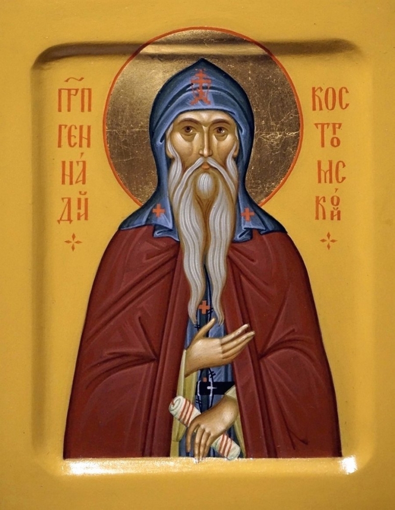 Преподобный Геннадий Костромской и Любимоградский (в миру Григорий) — святой Русской Православной Церкви, основатель Спасо-Преображенского Геннадиева монастыря (до 1647 года Новая Корнилиева пустынь). Вместе с братией участвовал в монастырских работах: рубил лес, носил дрова, делал свечи и пёк просфоры. Любимым занятием было писание икон, которыми он украшал обитель. Постоянно носил на себе тяжёлые вериги. Был духовником Ивана Грозного и крестил его дочь Анну. За свою святую жизнь преподобный Геннадий получил от Господа дар прозорливости и чудотворений. Исцеляя болящих, преподобный призвал их к покаянию и памятованию о часе смертном.