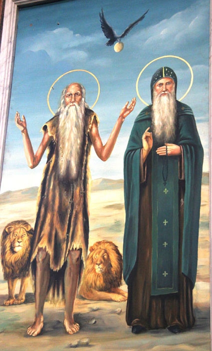 Святой Антоний уже около 70 лет жил в пустыне. Против воли, начал смущать его горделивый помысел, что здесь он старше всех. Но Господь открыл ему, что есть подвижник и старше его. Антоний отправился искать этого неизвестного миру подвижника. Путешествуя по необозримой пустыне он, наконец, пришел к пещере, где встретил убеленного сединами старца. Это был святой Павел Фивейский. Он уже около 90 лет жил в пустыне. Пока старцы беседовали спустился к ним ворон и положил хлеб. "Щедр и милостив Господь," - воскликнул Павел - "Вот сколько лет каждый день я получаю от Него полхлеба, а ныне ради твоего пришествия послал Он целый хлеб." Павел открыл о себе Антонию, что скоро отойдет из мира и попросил Антония принести к нему мантию епископа Афанасия, чтобы прикрыть ею его останки.