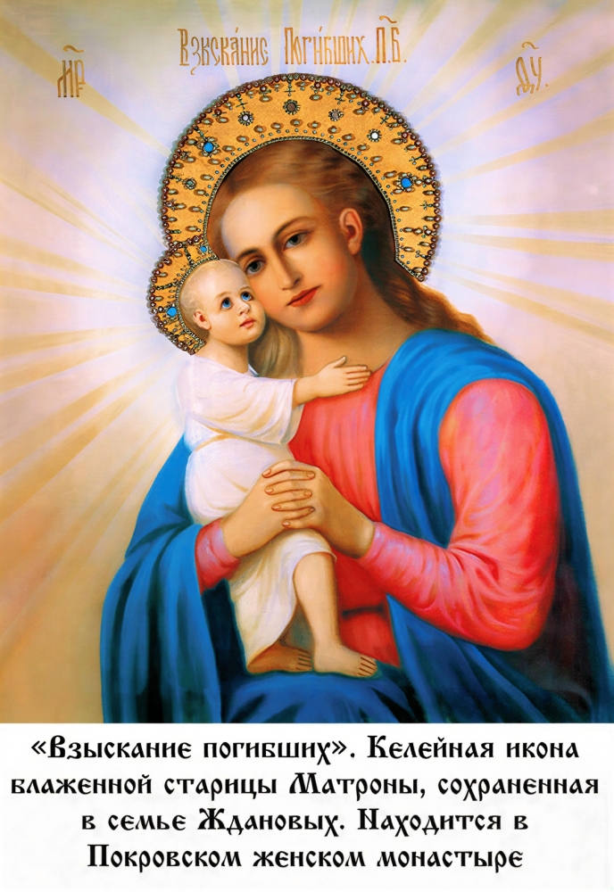 «Взыскание погибших» - это икона отцов и матерей, молящихся о своих детях, икона-утешительница родительской скорби. Ее еще называют «Избавление от бед страждущих».